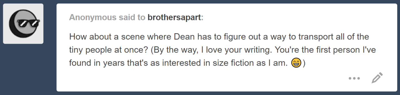 Dean let complete sincerity saturate his words, his green gaze warm and steady. This was something he wished he could have said a long, long time ago, when he’d first found Sam that fateful day, trying to hide from him in a motel room, smaller than a mouse. “Walt… I just wanted to thank you for what you did. Saving Sam all those years ago, even risking your own lives to do it. You and the others… you never have anything to fear from me. You have my word. Sam’s family is my family. Size be dammed.”