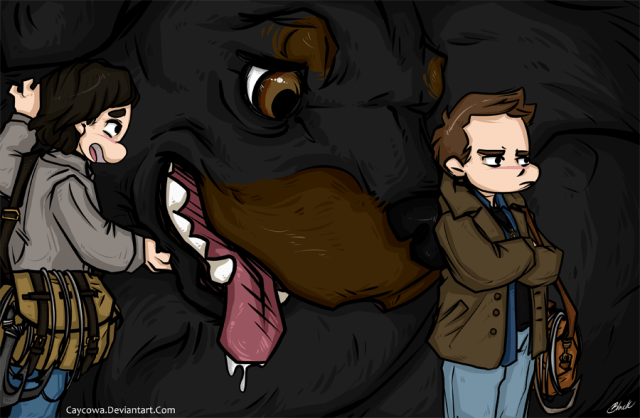 “But–” Sam’s protest cut off in shock when Dean pushed himself away from the side of the couch and went to stroll out into the open. It was too late for Sam to dive forward and grab his arm, and all he could do was watch Dean greet what was, to them, a giant.