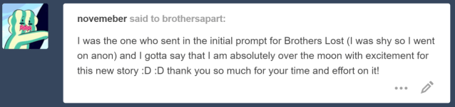 Aww, we all have to thank you for all this crazy your prompt gave birth too! I think Brothers Lost will have the most stories out of any of our AUs, based on the amount of ideas we come up with! When your prompt came in was the first time I got an idea that worked with both brothers tiny, and now it’ll never stop!