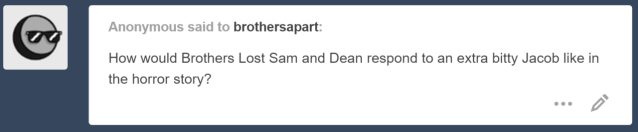 So get this, Sam and Dean are communicating by morse while interviewing a vic, but what they don’t know is that the vic knows morse code. The vic notices the actual fuck?! Who is he even talking to?? Are all FBIs like this? I guess I really am loosing it. Bonus question- are there any other characters who know morse code? Again, your stories are amazing and thank you so much for sharing them with all us :3