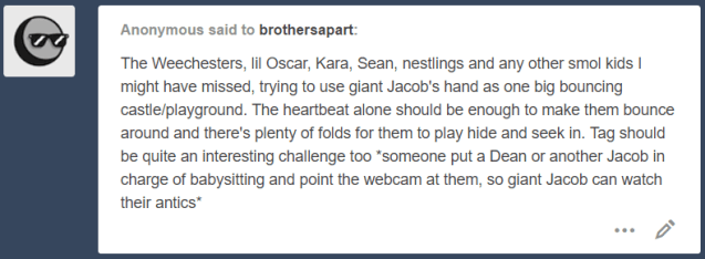 The brothers only remained up for a few more minutes. Dean did a quick check of Sam’s temperature and made sure no new injuries had cropped up during the harsh night.