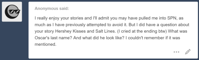 “Don’t worry about it,” Sam said, a smile blossoming over his face at the little guy. He pushed himself to his feet to give Oscar a little room to come out if he wanted, and glanced fondly back at Dean. “I know they’re a little big, but they both try,” Sam told Oscar. “I only just found Dean again yesterday.”