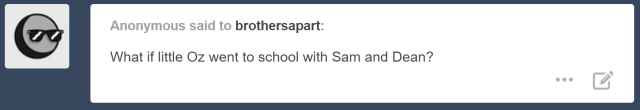 Dean lifted them out carefully. The contrast between the two kids was always stark when he took them out of hiding. Sam looked around with an innocent curiosity, putting his trust in his big brother to look after them even if he was still nervous about his new size. Oscar always tried to make sure he could hide behind Dean’s thumb or fingers. He wasn’t nervous about the size of everything. He was just nervous.