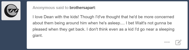 Walt stared back. The name Dean rung a bell… but for now he just wanted to get out of the room before worrying about this Dean grabbing him again. “I’m Walt,” he said gruffly as he walked to the back of the dresser. Just as he was about to slip back behind there and into the darkness he preferred, he glanced up at Dean, one last time. “Thanks for not being like those other hunters,” Walt said begrudgingly. “Not many would let someone like me go.”