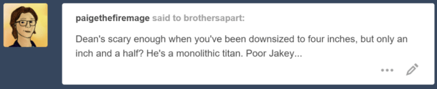 My gosh yes. His glare is hard to take for Sam, imagine having that glare leveled at you when you’re only a little bigger than one of his eyes! Jacob will need nerves of steel in this story, that’s for sure. Dean is close to 300 feet tall by comparison, a huge leap from the ~117 feet tall he is next to Sam.