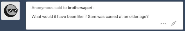 If Sam was cursed as an adult, he’d be even more in tune with Dean. They’d tease each other constantly, and he might be stressed about any thoughts of being stuck that way, but he’d have Dean with him and that’s a much better prospect that being trapped on his own.