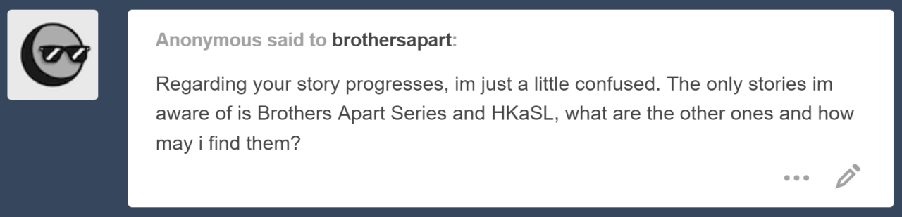 If you’re interested in where we are with future stories and how the writing is going, you can look at this page – Current Status of All AUs