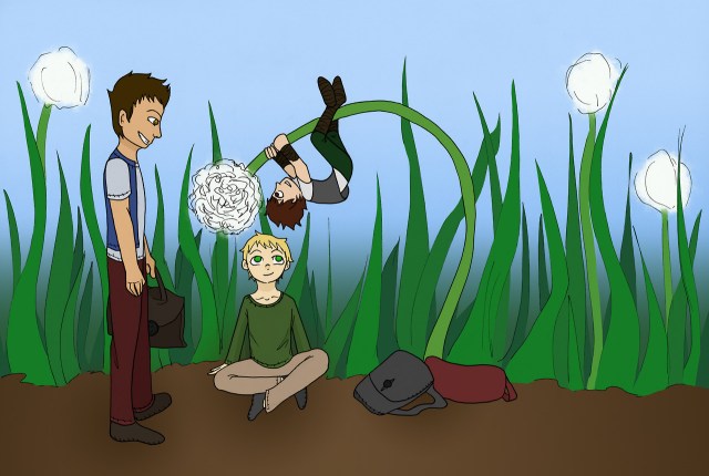 A commission for @neonthebright of her character Oscar and my characters Charlie and Sawyer. This takes place in an AU where they both adopt Oscar and give him all the love and food he deserves! (It’s probably the cutest AU ever.) Oscar’s never been outside before, so he’s having a fun time trying out all the new things to do!