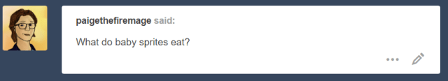 If we’re just talking about baby wood sprites (which are endearingly called sprouts), they nurse from their mothers or maybe a wet nurse, if needed. When they are a little more developed, they can have soft fruits if they’re mashed/chewed a bit for them first, much like a human infant. The important part is making sure they eat enough. Their little wings remain curled up in their little leaf bud shapes while they’re young, so they don’t get very much from the sun. Wood sprite mamas fuss about their babies getting enough energy most of the time.