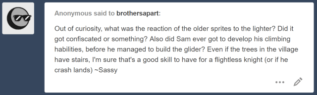 @neonthewrite– Regarding the lighter, the older sprites most likely reacted a lot like Bowman did. Amazed and wary, and surprised that he can hold even a small fire in his hand. Since he’s the expert with it, they’d most likely leave it to him simply out of fear of accidentally setting it off themselves (they really really don’t like fire).